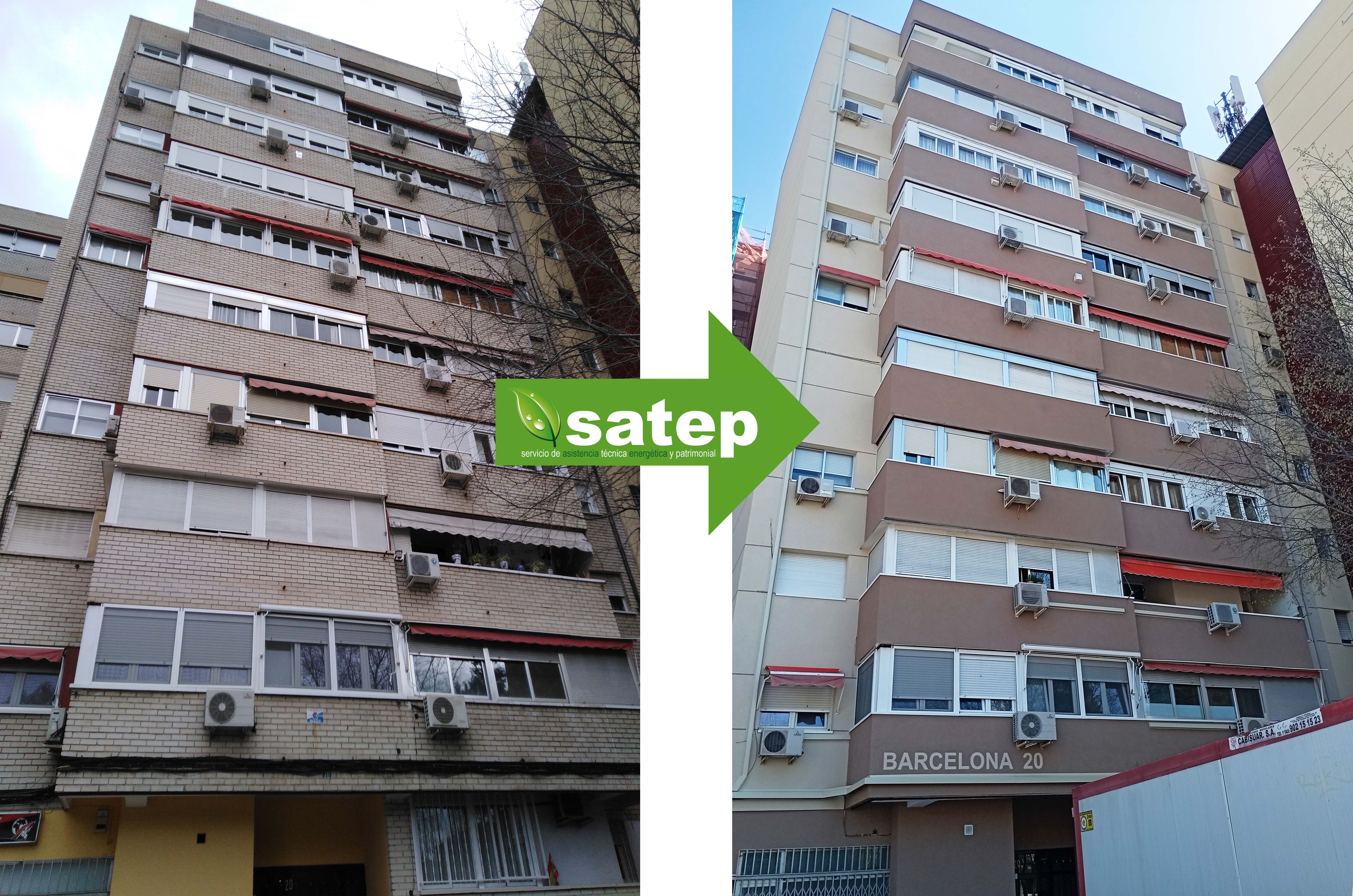 Concluyen los trabajos de rehabilitación de fachada, y cubierta, con mejora de la eficiencia energética, en calle Barcelona 20, Fuenlabrada. Los trabajos generarán una mejora próxima al 43% en la demanda de climatización del edificio, y un ahorro teórico superior al 30% en el consumo de energía primaria no renovable.