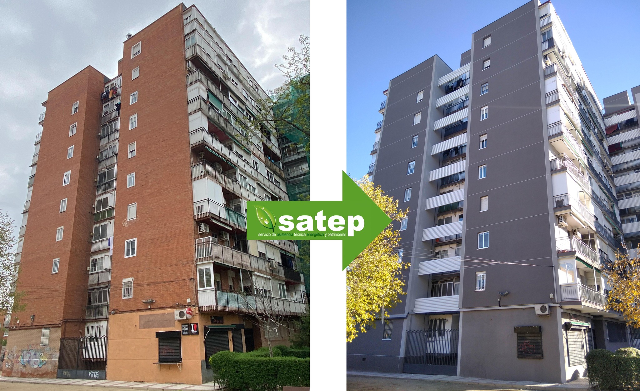 Concluyen los trabajos de rehabilitación de fachada y mejora de la eficiencia energética en calle Mónaco 4, Fuenlabrada, sobre proyecto y dirección de obra SATEP. Los trabajos provocarán un ahorro estimado de 115.000 Kwh/año